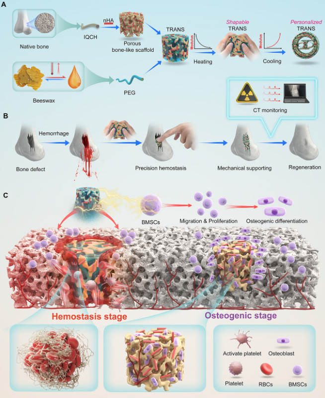 该研究提出了一种仿生策略,开发了一种集止血、成骨和实时监测功能于一体的热适应性、CT可视化骨支架(TRANS)。该支架通过模仿天然骨的结构和组成,利用热敏性含碘壳聚糖衍生物和纳米羟基磷灰石构建多孔骨样支架,并浸润PEG以获得蜂蜡样可塑性。这种仿生支架在加热时迅速软化以紧密密封不规则骨缺损,实现高效机械止血,其爆破压力达到146.3 kPa,止血时间仅为1.47分钟,约为商业骨蜡的四分之一。当温度降至生理水平时,TRANS恢复高机械强度以维持结构稳定性。值得注意的是,植入的TRANS通过在PEG移除后提供多孔网络以促进营养交换和细胞浸润,并通过激活TGF-β信号通路促进骨髓间充质干细胞增殖和成骨分化,从而增强骨再生。在胫骨穿孔缺损模型中,TRANS植入在10周内显著促进骨再生。CT监测显示了支架降解与新骨形成的同步过程,有效弥合了止血和骨修复之间的差距。这种非侵入式可视化功能将传统的骨再生"黑箱"转化为可观察的过程,为骨支架的迭代优化提供了数据驱动的概念框架。