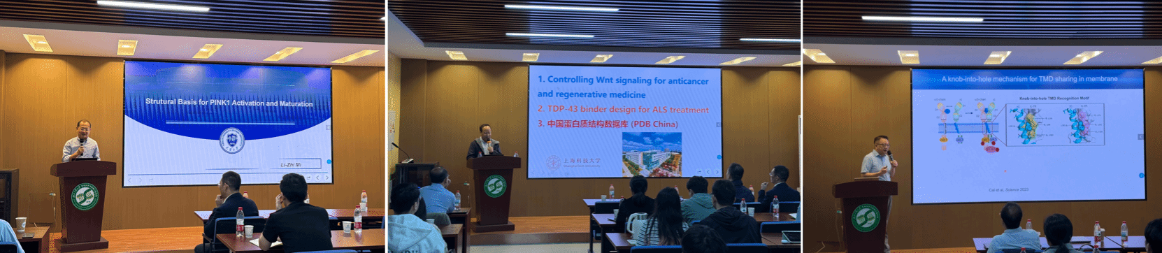 在“细胞信号传导的结构生物学”专题学术会议上,三位专家分别以《Protein science in the AI era: from structural biology to protein design》、《Filling the knowledge gaps of cytokine receptor in membrane》、《Structural basis for the activation and maturation of mitophagy regulator PINK1》为题作了精彩的学术报告,报告由生命科学与健康工程学院潘军华教授主持。报告内容包含相关领域学术前沿的开创性研究,逻辑严谨,数据翔实,兼具理论深度与实践指导意义。同时,三位专家还结合自身科研经历,分享了在学术研究过程中遇到的挑战与解决思路,鼓励在场师生勇于探索、敢于创新,现场学术氛围浓厚,互动交流热烈,在场师生均表示受益匪浅。